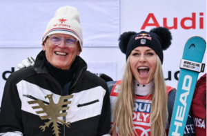 Lindsey Vonn celebrates with her dad Alan Kildow in Dec. 2025.Jeff PACHOUD / AFP via Getty
