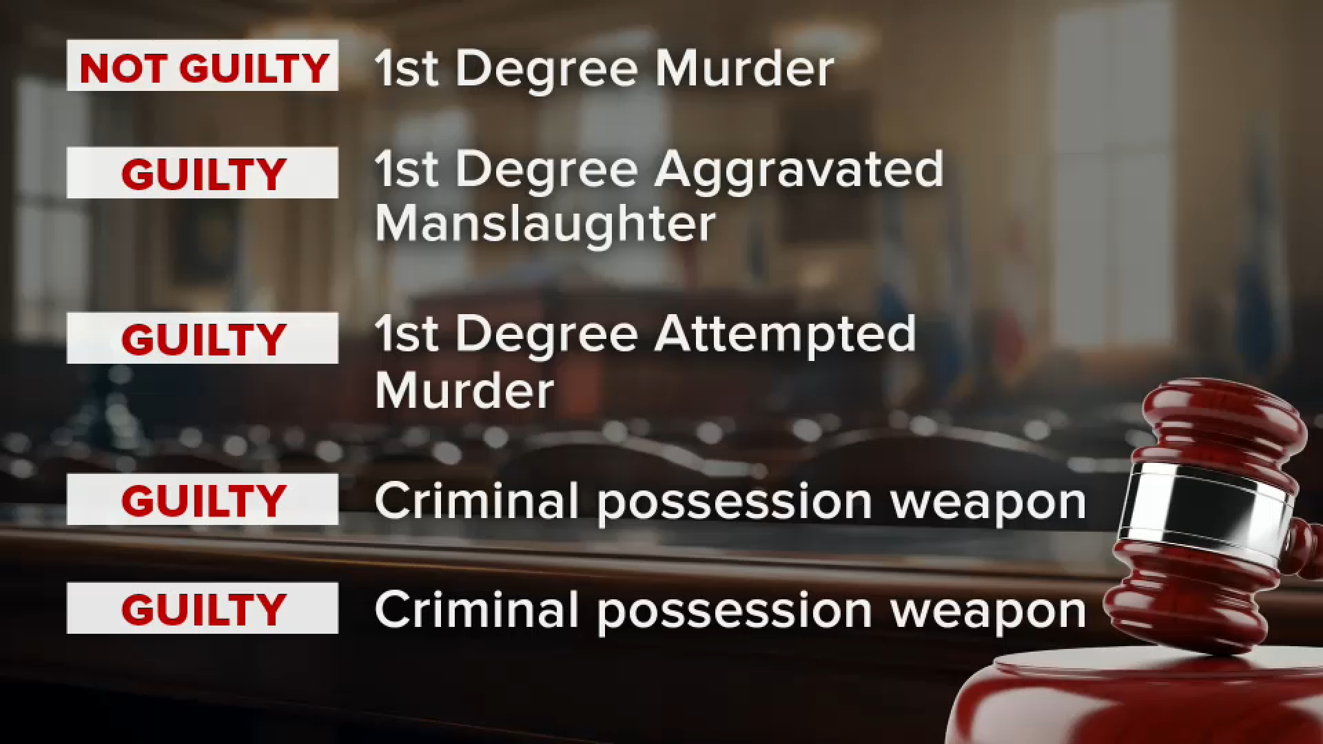 The 36-year-old was found not guilty of first-degree murder, but was found guilty of first-degree aggravated manslaughter, attempted murder, and two counts of criminal possession of a weapon.