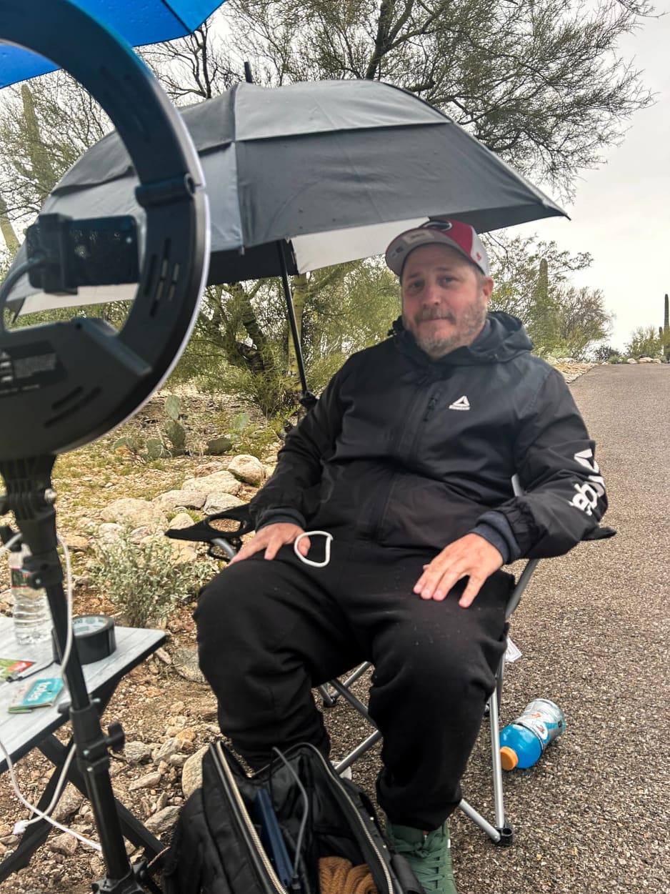 Jimmy Williams, host of YouTube true crime channel Dolly Vision, has spent five days camped outside Nancy Guthrie’s home. Today, he sat under an umbrella surrounded by a small cooler, laptop, ring light, earbuds and a phone.