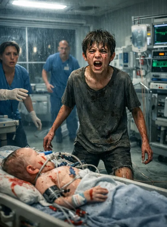 He stood behind the hospital, pressed close to the wall where the wind was weakest. His thin frame trembled beneath an oversized grey shirt that clung to him, soaked through. His bare feet rested against the cold concrete, toes curled slightly as if trying to hold onto what little warmth remained in his body.