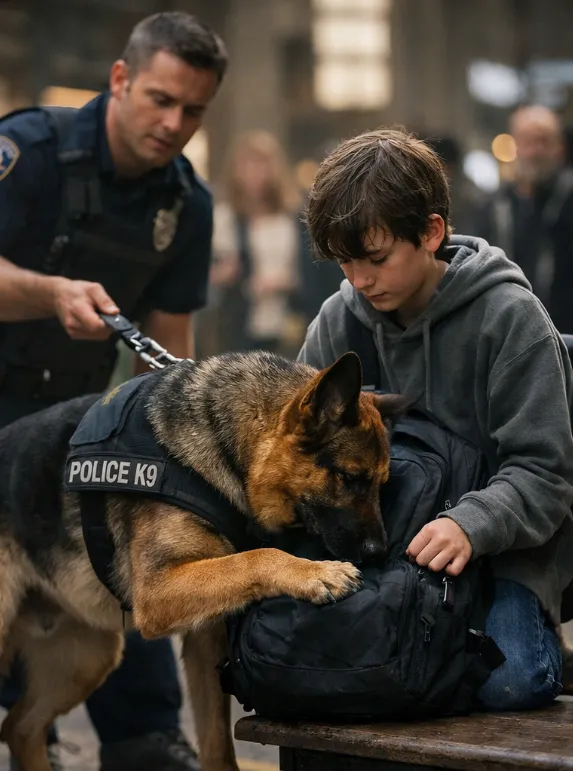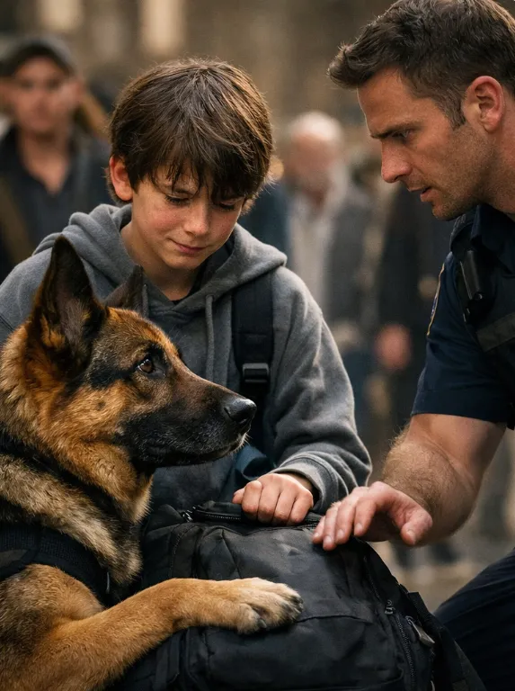 “Why is the police dog guarding that boy’s backpack like it belongs to someone he used to love… and why won’t he let anyone touch it?”